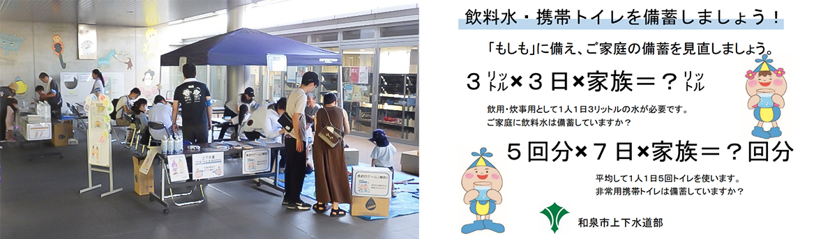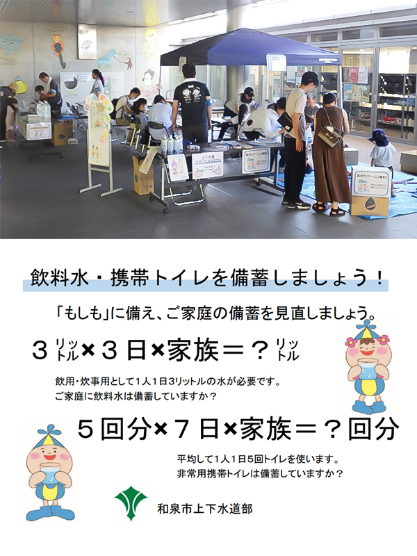 また、災害時に役立つ「飲料水」や「携帯トイレ」の備蓄の必要性について、啓発活動を行いました。災害時には上下水道が使用できなくなる可能性があります。
