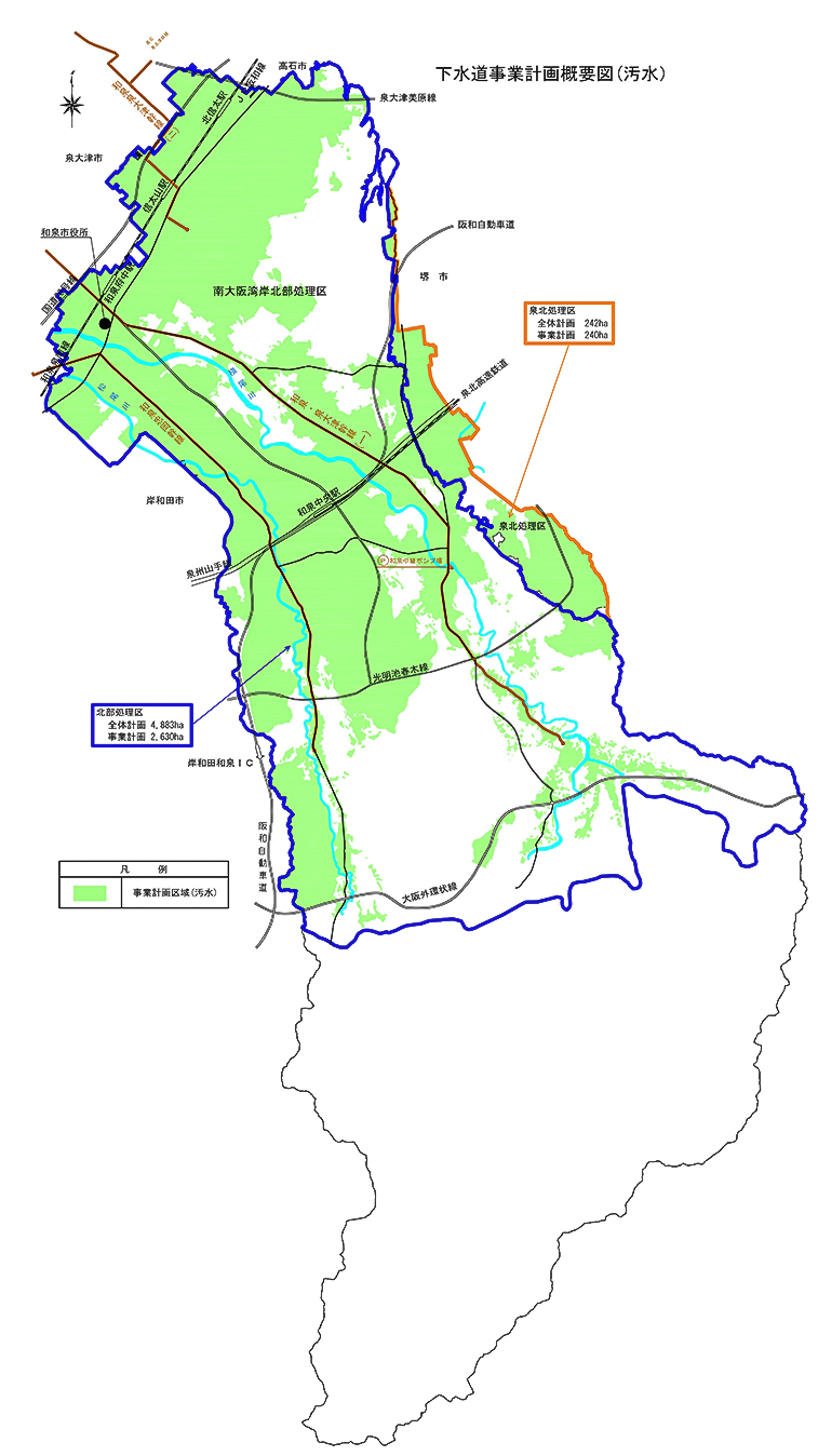 和泉市には、南大阪湾岸流域下水道北部処理区と泉北ニュータウン周辺の泉北処理区の2処理区があり、それぞれの処理区の計画概要は下表のとおりとなっています。